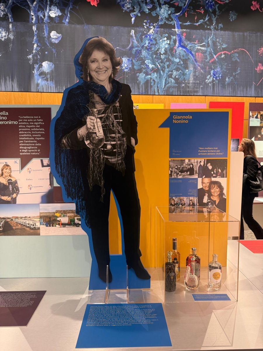 Accanto a questa esperienza, la mostra ripercorre anche la storia della famiglia Nonino, (cav del lav Giannola Nonino con le figlie Cristina Elisabetta Antonella) custode di una tradizione distillatoria che affonda le proprie radici nel 1897. Un percorso che si intreccia con una marcata valorizzazione del lavoro femminile: oggi, infatti, il 75% del personale della distilleria è composto da donne, in un settore storicamente dominato dalla presenza maschile.