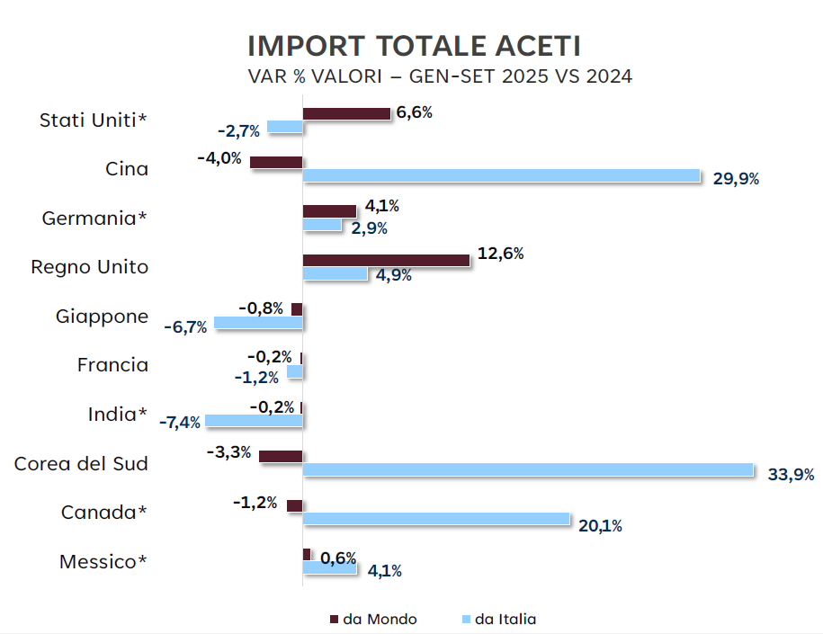Anche gli aceti italiani trovano nuove opportunità internazionali. La Corea del Sud emerge con un incremento del 33,9%, seguita dalla Cina con un +29,9% e dal Canada che cresce del 20,1%. Tre mercati che confermano una domanda dinamica e orientata verso prodotti di qualità e ad alto contenuto identitario