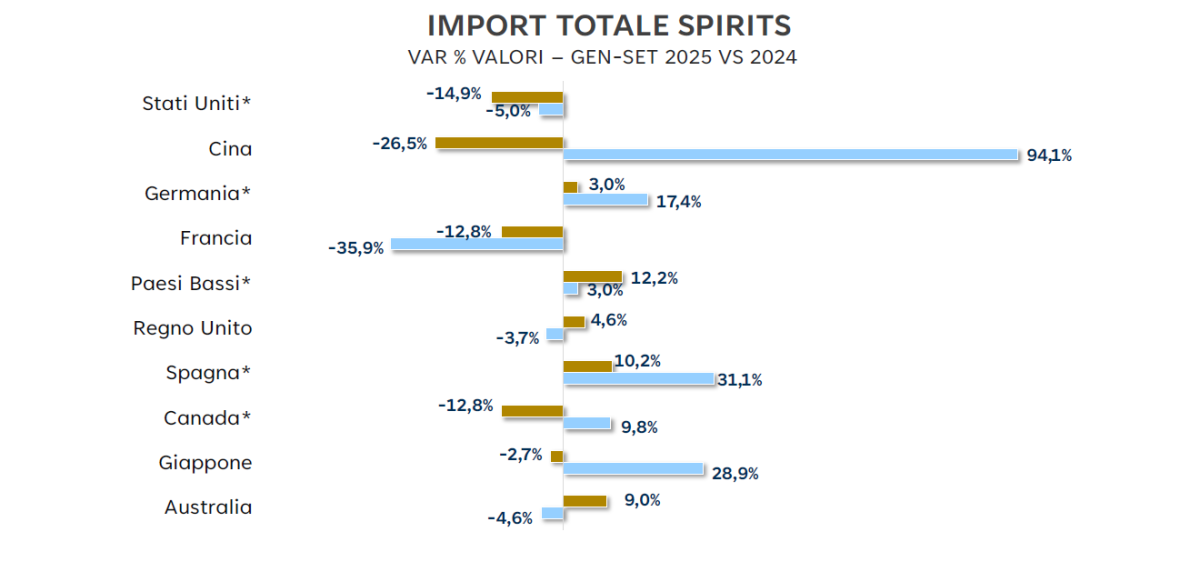 Nel comparto degli spiriti, l’asse di crescita si sposta verso l’Asia-Pacifico e il Nord America. La Cina segna un balzo del 94,1%, un ritmo che testimonia l’interesse crescente verso prodotti premium e di provenienza certificata. Il Giappone mostra un progresso del 28,9%, mentre il Canada registra un +9,8%, rafforzando ulteriormente la sua posizione tra i mercati più solidi per il settore.