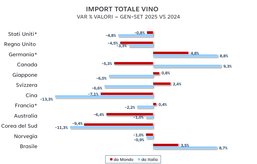 Parallelamente, il monitoraggio dell’Osservatorio mette in luce una serie di mercati alternativi che stanno imprimendo nuovo slancio alla filiera italiana. Per il vino emergono segnali incoraggianti soprattutto dall’Europa e dal Sud America: la Germania registra una crescita dell’import dell’8,8%, confermandosi un partner commerciale di primaria importanza, mentre il Brasile segue con un aumento dell’8,7%.