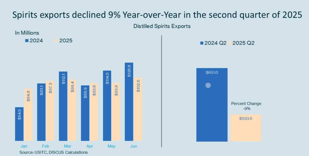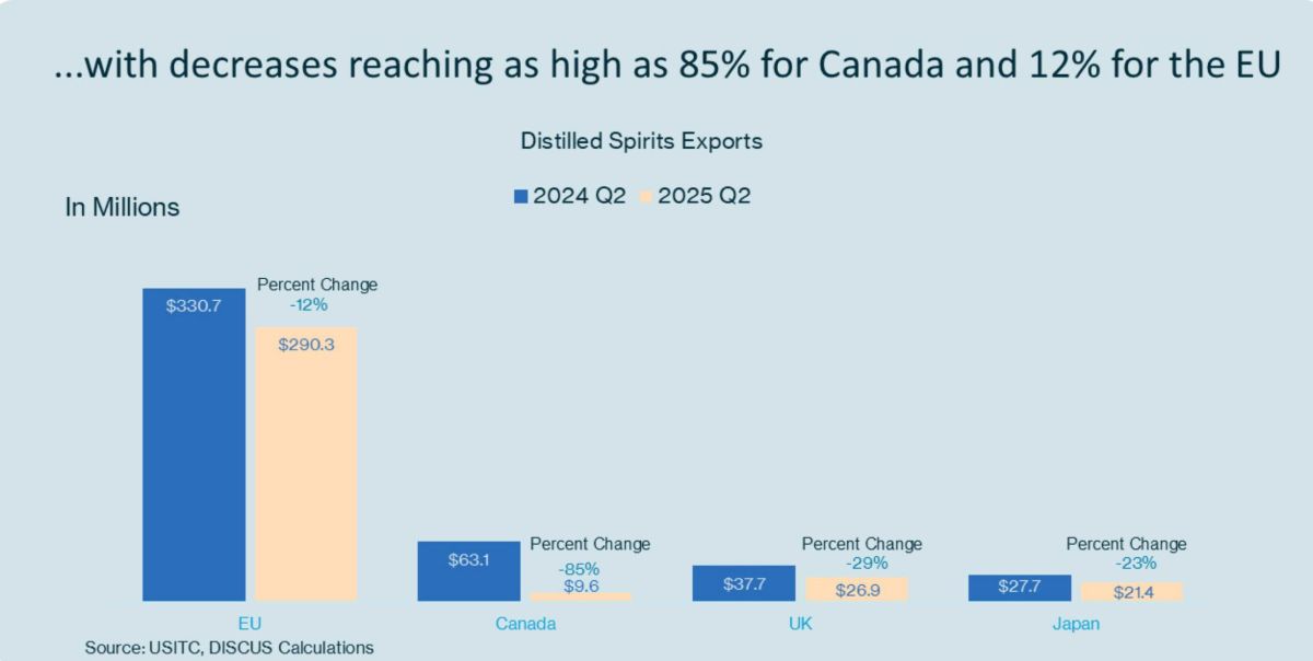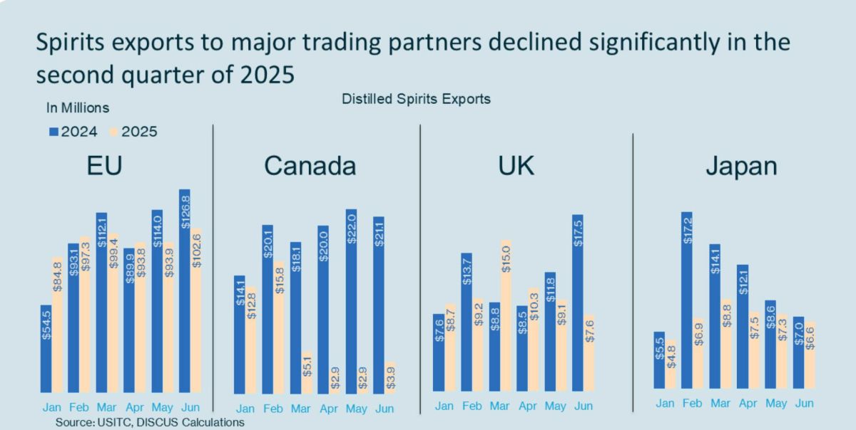 Il 6 ottobre 2025, il Distilled Spirits Council of the United States (DISCUS) ha pubblicato un rapporto secondo cui le esportazioni di liquori distillati statunitensi sono calate del 9% su base annua nel secondo trimestre del 2025. DISCUS ha sottolineato che «i cali sono stati particolarmente marcati verso i principali mercati di riferimento», tra cui Canada, Unione Europea, Giappone e Regno Unito, che rappresentano complessivamente il 70% del valore totale delle esportazioni.