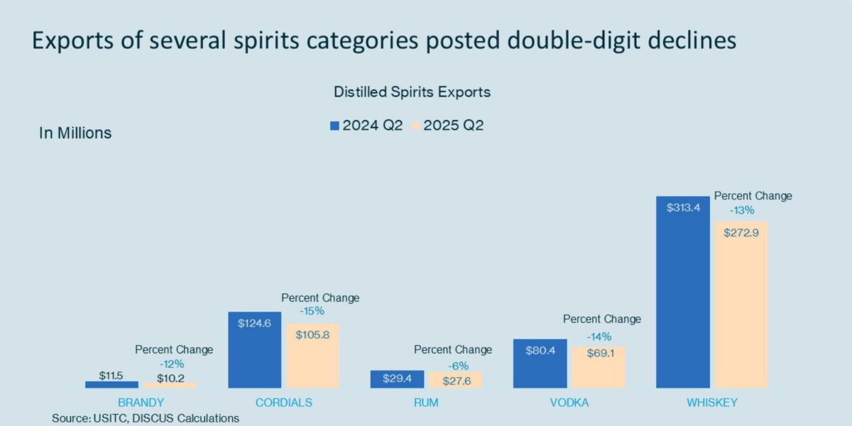 Il presidente e CEO di DISCUS, Chris Swonger, ha evidenziato «una crescente preoccupazione per il fatto che i consumatori internazionali scelgano sempre più spesso distillati di produzione locale o importati da Paesi diversi dagli Stati Uniti, segnalando un progressivo allontanamento dai marchi storici dei grandi spiriti americani». Le esportazioni di diverse categorie di alcolici hanno registrato cali a doppia cifra, tra cui il brandy (-12%), whisky americano (-13%), vodka (-14%) e cordiali (-15%), mentre le esportazioni di rum sono diminuite del 6%.