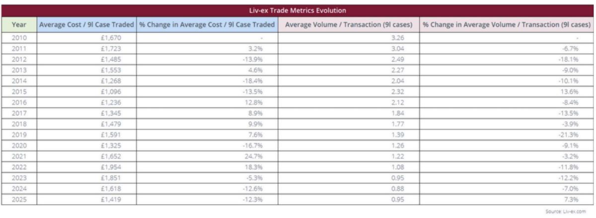 A dicembre, l'indice Liv-ex 1000 (la misura più ampia del mercato) ha chiuso il 2025 in calo del 4,5%, mentre il costo medio per cassa scambiata è sceso del 12,3%. "Ciò indica che, mentre l'impronta complessiva dei vini scambiati è rimasta simile negli ultimi cinque anni, il 2025 ha visto un aumento dei volumi di scambio per i vini a prezzi più bassi", afferma il rapporto, con un calo totale degli scambi del 5,8% rispetto al 2024 e un aumento dei volumi di scambio del 7,2% rispetto al 2024.