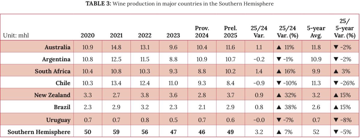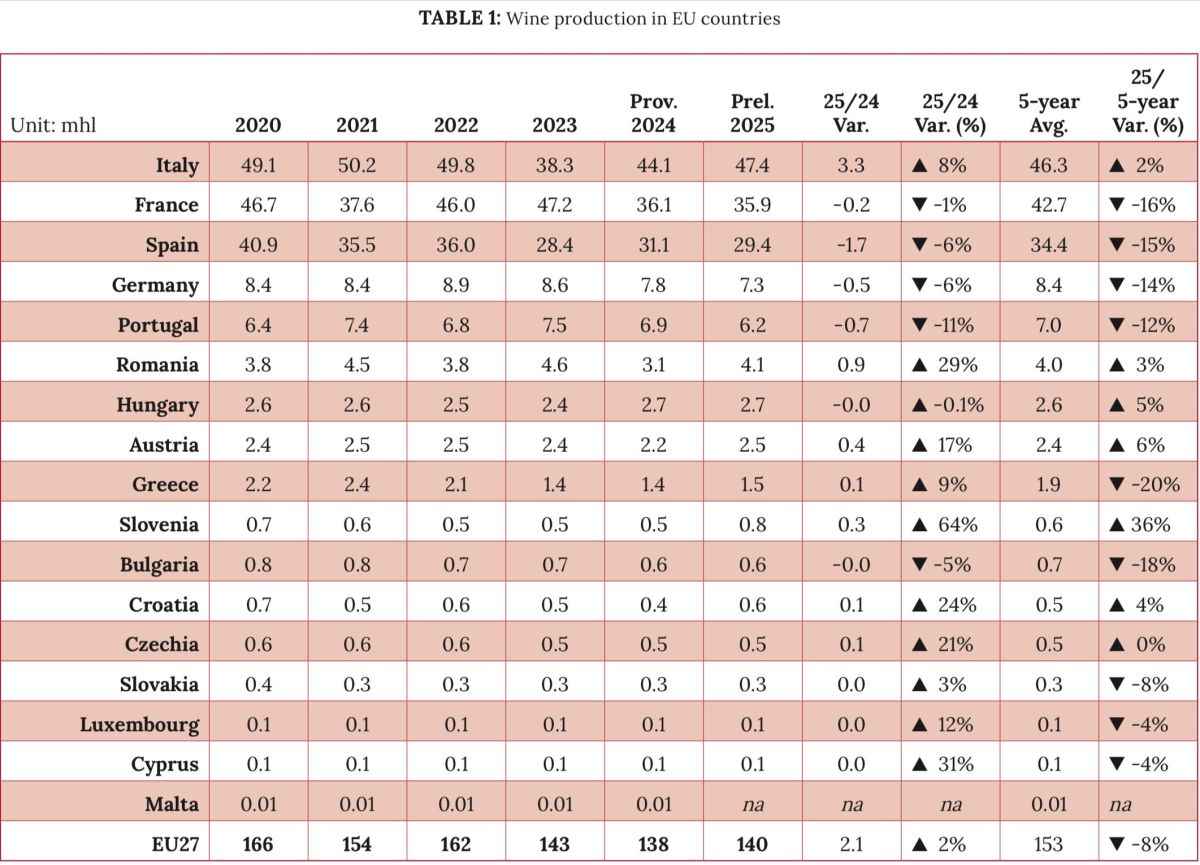 L'Italia rimane il più grande produttore mondiale di vino nel 2025 (47,3 milioni di ettolitri), davanti alla Francia (35,9 milioni di ettolitri) e alla Spagna (29,4 milioni di ettolitri). Gli Stati Uniti sono al quarto posto, mentre l'Australia si riprende dal raccolto più scarso del 2024 e riconquista il quinto posto nella classifica mondiale dei produttori nel 2025, davanti all'Argentina, al sesto posto, che è il più grande produttore del Sud America.