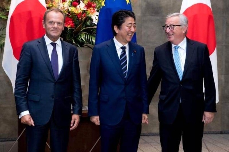 Siglata a Tokyo l'intesa tra Giappone e Ue. Un accordo sul libero scambio commerciale che prevede da parte giapponese l'azzeramento dei dazi sul 94% di tutte le importazioni provenienti dall'Unione europea, incluso l'80% di tutti prodotti ittici e agricoli. Il presidente della Commissione europea Jean-Claude Juncker, il presidente del Consiglio Ue Donald Tusk e il premier nipponico Shinzo Abe, i firmatari.