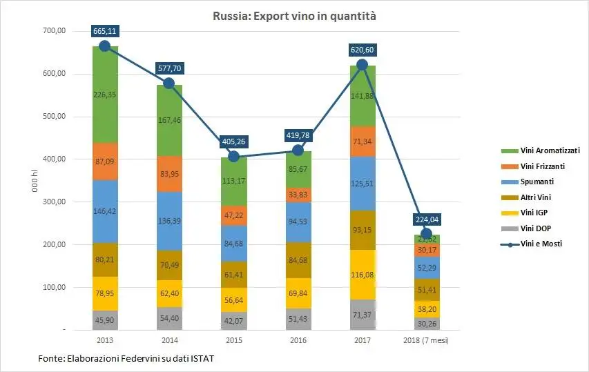 Scendendo nel dettaglio, sono stati disaggregati i dati delle esportazioni di vino. Si nota come le tendenze in valore ed in quantità siano in flessione nel 2014, anno di entrata in vigore delle misure restrittive, per poi salire negli anni successivi fino a registrare un buon incremento nel 2017. “Prendendo a riferimento l’anno scorso, in valore, notiamo una buona performance dei vini spumanti con 38 milioni di Euro, seguiti dai vini DOP con quasi 28 milioni di Euro. In volume il primato spetta ai vini aromatizzati con quasi 142 mila hl, seguiti dai vini spumanti con 125 mila hl”. Nei primi 7 mesi del 2018 (dati provvisori) in volume ed in valore, al momento, spiccano i vini spumanti.