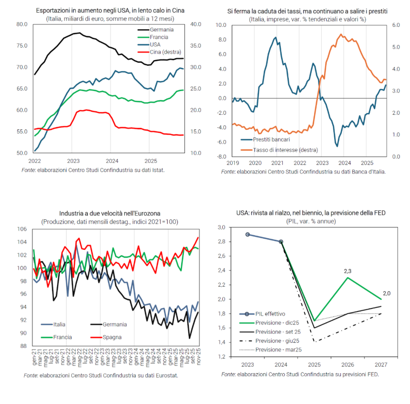 Come constatato dall’ultima Congiuntura flash del Centro Studi Confrindustria, il quadro congiunturale di fine 2025 evidenzia un andamento ancora volatile dell’industria. A novembre la produzione industriale recupera (+1,5% da -1,0%), determinando una variazione acquisita nel quarto trimestre pari a +1,0%, ma a dicembre il PMI rientra in area recessiva (47,9 da 50,6), così come la fiducia delle imprese, caratterizzata da un andamento altalenante.