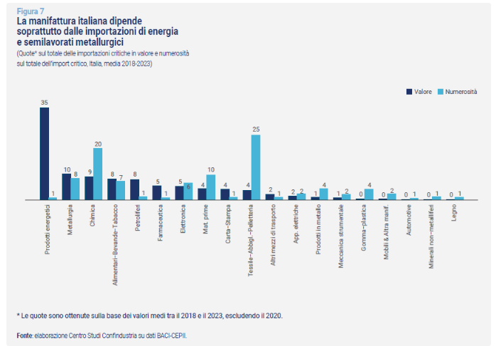 Per l’Italia, il tema delle dipendenze strategiche riguarda un ampio insieme di beni intermedi e materie prime. La manifattura nazionale dipende infatti in modo significativo da forniture extra-UE per 364 prodotti — tra materie prime, semilavorati e beni capitali — per un valore complessivo di circa 26 miliardi di euro. I comparti più esposti risultano quelli dei semilavorati metallurgici e dell’energia, mentre la Cina si configura come il principale fornitore dei prodotti considerati critici.