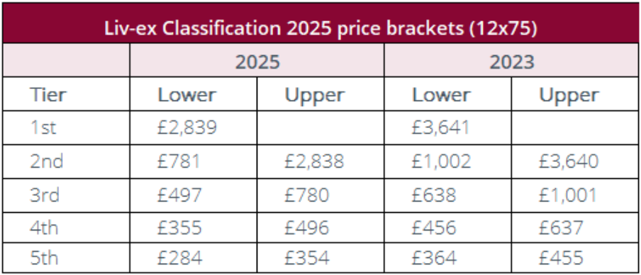 Le fasce di prezzo per la Classificazione Liv-ex 2025 (e quelle dell’edizione 2023) sono le seguenti: