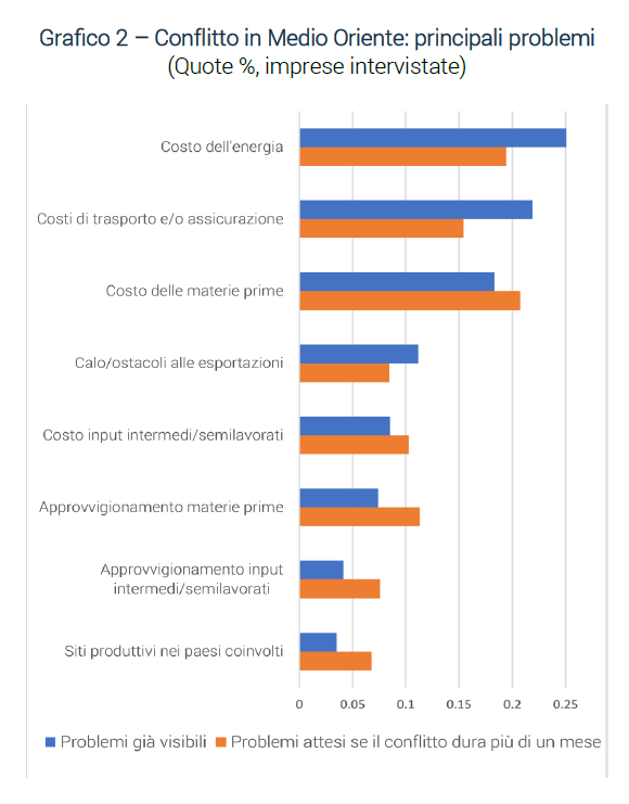 Nel questionario di marzo è stato inoltre approfondito l’impatto del conflitto in Medio Oriente, chiedendo alle imprese di indicare i principali problemi o ostacoli già riscontrati e quelli attesi nel caso di un prolungamento delle tensioni oltre un mese. Dai risultati emerge che i principali fattori di pressione sono rappresentati dal costo dell’energia, indicato come il più rilevante dal 25,0% dei rispondenti, dai costi di trasporto e assicurazione, segnalati dal 21,9%, e dal costo delle materie prime non energetiche, citato dal 18,4%.